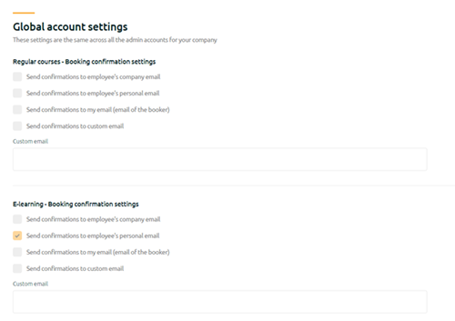 - Send confirmations to employee’s company email: This will send a confirmation email to the secondary email of your employee once a course is booked. If you only register one email address for your employees, please use the personal email field.