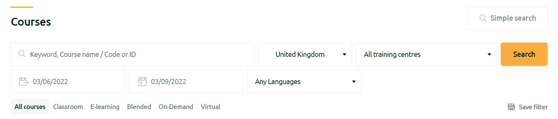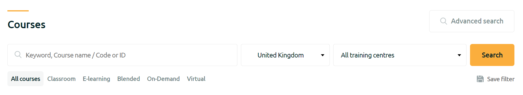 Choose a country and a training centre to refine your search results. Lastly, click the yellow "Search" button and the results will be displayed.