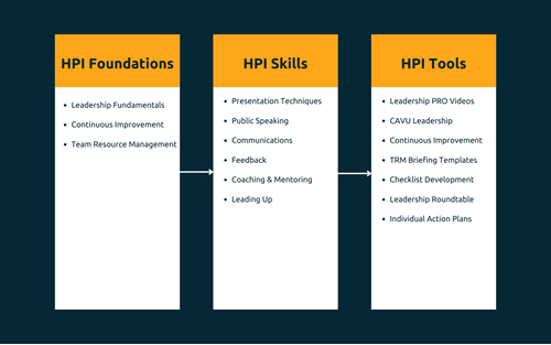 Within the HPI course, students also get access to CAVU’s Leadership PRO online course. This course offers an online library of relevant and engaging videos that students can connect to real-world situations - all accessible from phone, tablet or laptop. Students can access regularly updated material in a growing library of usable and relevant information. In the 70+ videos, CAVU covers important fundamentals on leadership, continuous improvement and team resource management. Through this course, CAVU manages to deliver the fundamental skills and actions that transform participants into great leaders.