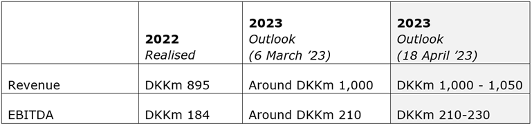 Based on the first three months’ performance and a healthy outlook across sectors, the Group has upgraded its 2023 guidance to a revenue between DKK 1,000-1,050 million and an adjusted EBITDA between DKK 210-230 million.